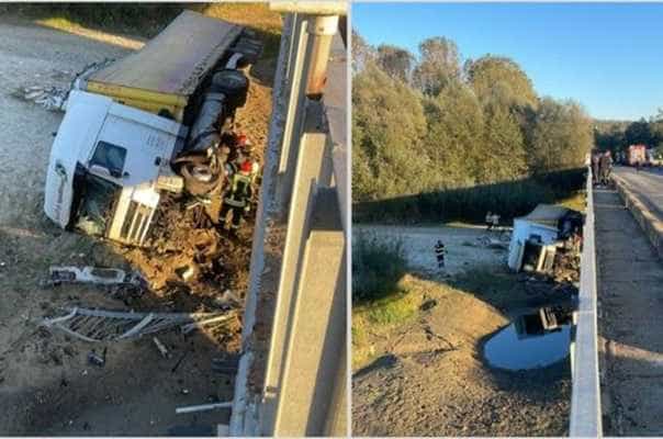 Accident pe DN 7. Un TIR a căzut de pe pod, după ce a lovit o betonieră