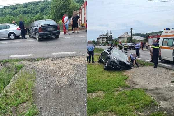 În urma coliziunii, unul dintre vehicule a intrat într-o podișcă, iar o persoană a rămas blocată în interiorul mașinii.