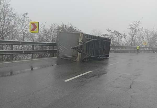 Din primele informații, șoferului unui TIR ar fi pierdut controlul asupra vehiculului, iar remorca autotrenului s-a răsturnat.