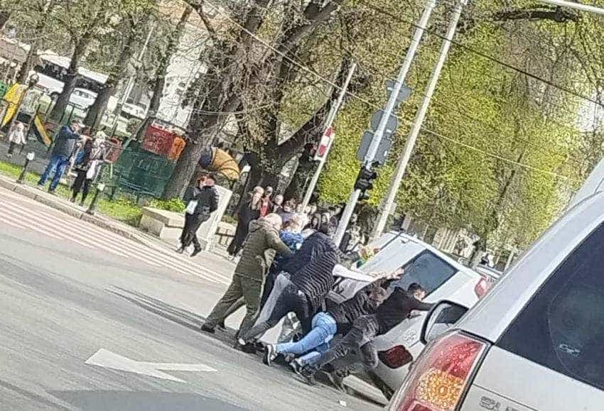 Din fericire, oamenii prezenți în zonă au sărit în ajutorul șoferului, reușind să îl scoată rapid din autoturismul răsturnat.