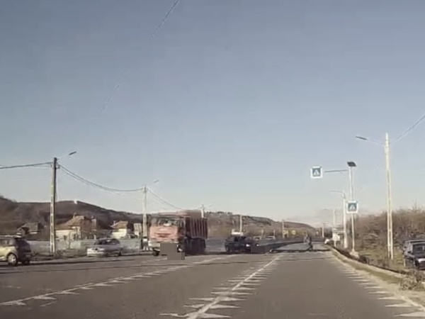 Pe imaginile surprinse de o cameră de bord se observă cum basculanta, care circula pe banda întâi, a schimbat brusc direcția și a intrat pe banda a doua, unde a izbit în plin un autoturism oprit regulamentar la trecere.