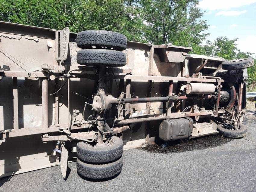 Este vorba despre o autoutilitară, răsturnată pe partea carosabilă.