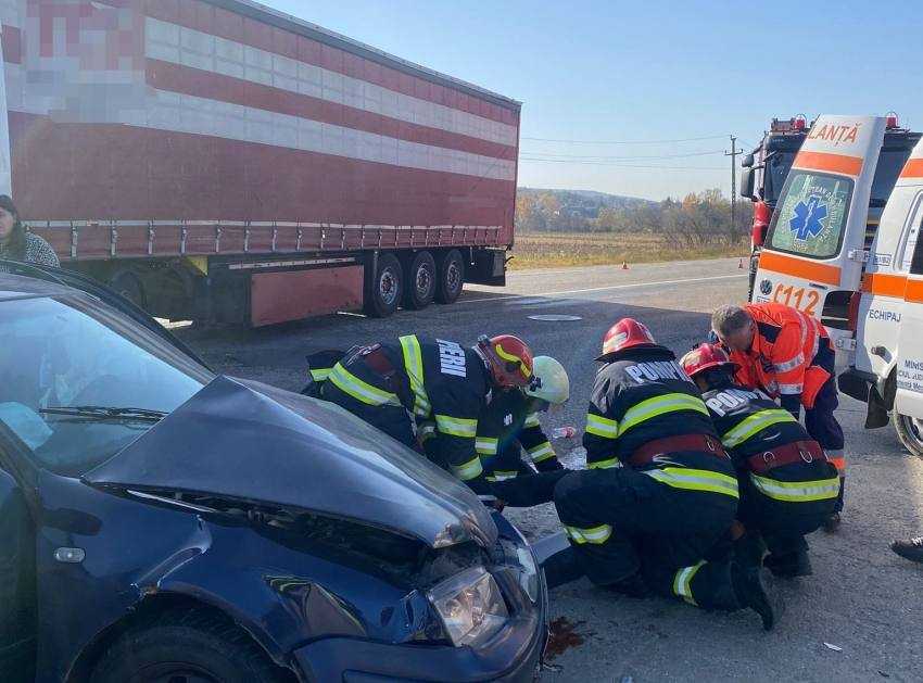 Din primele date, sunt implicate un autoturism și un TIR, iar în urma impactului, o persoană este rănită.