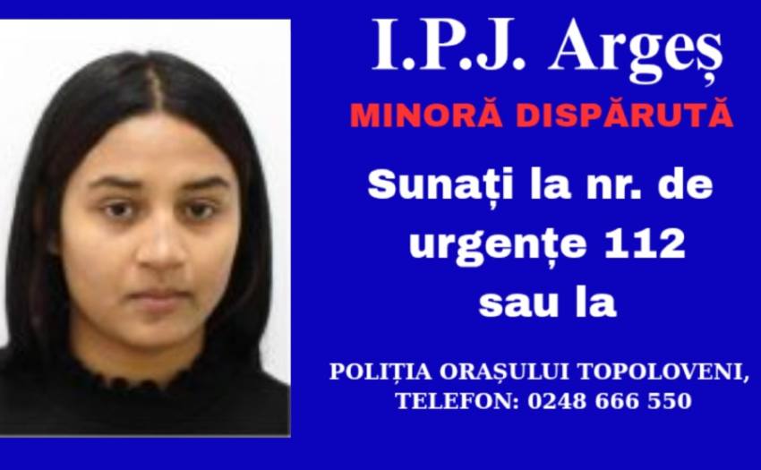 Persoanele care pot da relații cu privire la minora în cauză sunt rugate să apeleze Serviciul Național Unic Apeluri de Urgență 112 sau Poliția Orașului Topoloveni, la telefon 0248 666 550”, transmite IPJ Argeș.