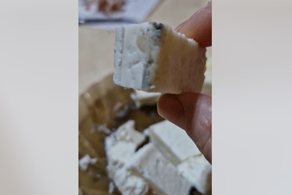 Femeia lucra la meniul pentru 8 Martie, iar un membru al familiei a mers la cumpărături. Printre produsele achiziționate se afla și un pachet de telemea de vacă. Când a ajuns acasă și a început să taie brânza, a observat că aceasta era mucegăită.