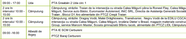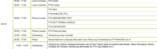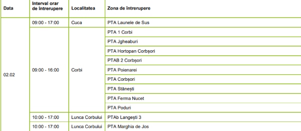 - Luni, 2 februarie – Cuca, Corbi și Lunca Corbului. Vor fi afectate mai multe puncte, după cum se poate observa în tabelul de mai jos.