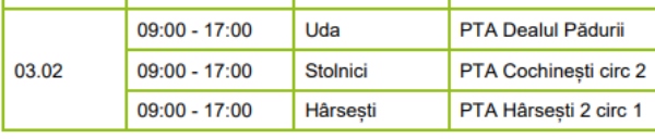 - Marți, 3 februarie – între 09:00 și 17:00: Uda, Stolnici și Hârsești (PTA Dealul Pădurii și zone aferente)