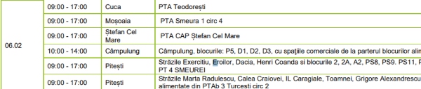 - Miercuri, 4 februarie – între 09:00 și 17:00: Pitești, Lunca Corbului și Poiana Lacului, respectiv între 10:00-14:00/ 10:00-15:00: Câmpulung.