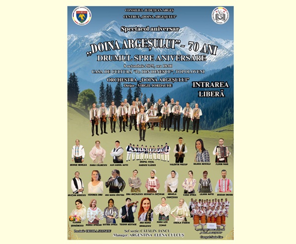 Orchestra „Doina Argeșului” continuă seria evenimentelor aniversare dedicate celor 70 de ani de activitate și ajunge la Topoloveni. Pe 8 octombrie 2025, de la ora 18:00, Casa de Cultură „Pr. Ion Ionescu” va găzdui un spectacol special.