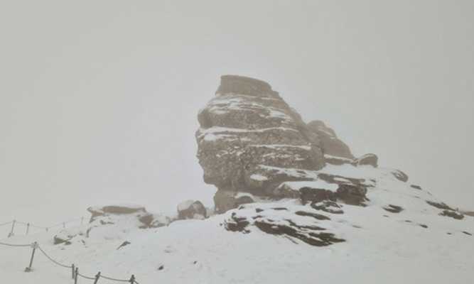 Sfinx-ul din Bucegi a fost şi astăzi vizitat de sute de oameni. Se pare că nici măcar viscolul nu a reuşit să-i oprească, chiar dacă pe o astfel de vreme şi-au pus viaţa în pericol.