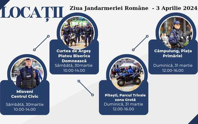 Pentru a marca împlinirea la 174 de ani de la înființarea Jandarmeriei Române, jandarmii argeșeni vor desfășura desfășura o serie de activități dedicate cetățenilor, în mai multe localități din județ.