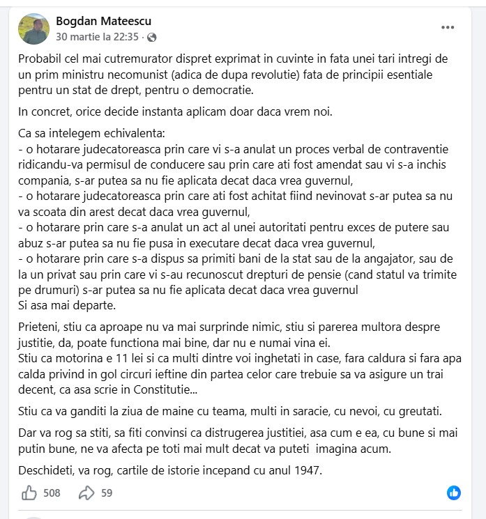 Dar vă rog să știți, să fiți convinși că distrugerea justiției, așa cum e ea, cu bune și mai puțin bune, ne va afecta pe toți mai mult decât vă puteți imagina acum.” – a scris Bogdan Mateescu în urmă cu câteva săptămâni pe pagina sa de Facebook.