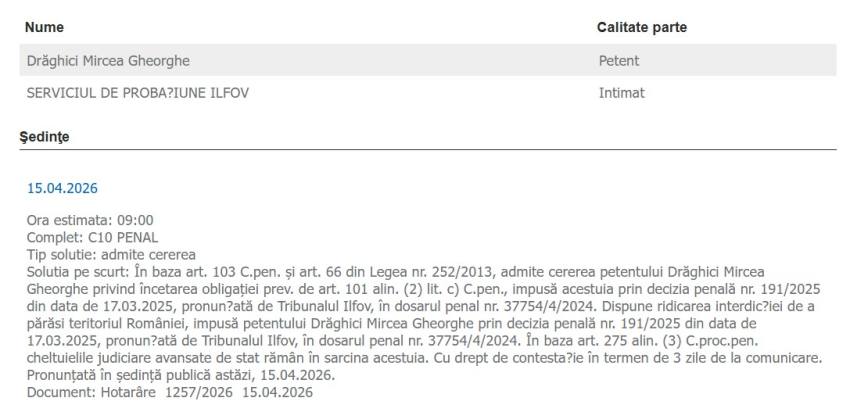 Eliberat condiţionat din închisoare în primăvara anului trecut, fostul deputat Mircea Drăghici a primit săptămâna trecută o veste bună de la Judecătoria Sectorului 4. Magistraţii bucureşteni au admis cererea fostului parlamentar PSD Argeş de a ieşi din ţară, dispunând ridicarea interdicţiei de a părăsi teritoriul României, impusă lui Mircea Drăghici prin decizia penală nr. 191/2025 din data de 17 martie 2025, pronunţată de Tribunalul Ilfov.