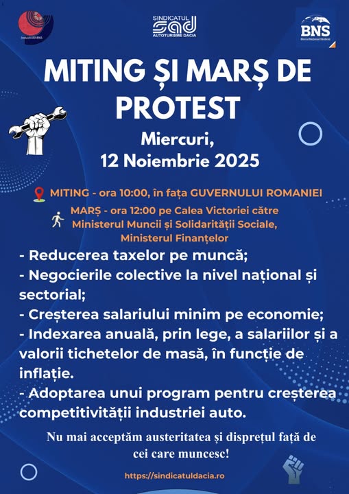 Miercuri, 12 noiembrie, vor fi proteste în fața sediului guvernului, mitingul fiind organizat de către Blocul Național Sindical. Din mulțimea de mii de salariați din întreaga țară, vor face parte și 500 de membri ai Sindicatului Autoturisme Dacia (SAD).