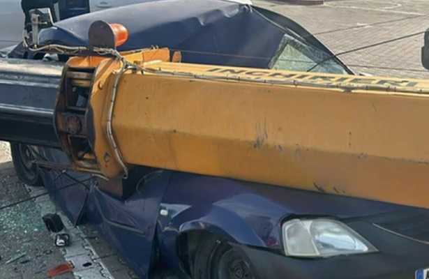 Un incident nefericit a avut loc astăzi în Capitală. O macara s-a prăbușit peste o mașina parcată lângă o benzinărie din Sectorul 4.