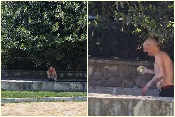 Imaginile au fost surprinse într-una din fântânile arteziene din centrul municipiului Pitești, când afară erau 35 °C. Bărbatul de 54 de ani a intrat în fântână să-și facă baie. Este pentru a doua oară când face acest lucru pentru că și săptămâna trecută polițiștii locali l-au surprins în aceeași ipostază.