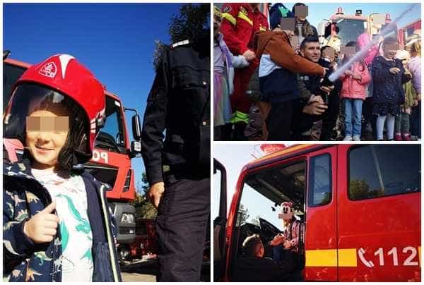 Micuții au îmbrăcat haina de pompieri, au urcat în autospecialele de intervenție, iar cei mai îndrăzneți au testat presiunea furtunului, ca și când ar fi stins un incendiu.