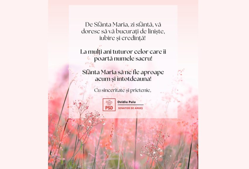 Senatorul Ovidiu Puiu transmite urări de Sfânta Maria, dorindu-le sărbătoriților liniște, iubire și credință, alături de protecția Maicii Domnului.