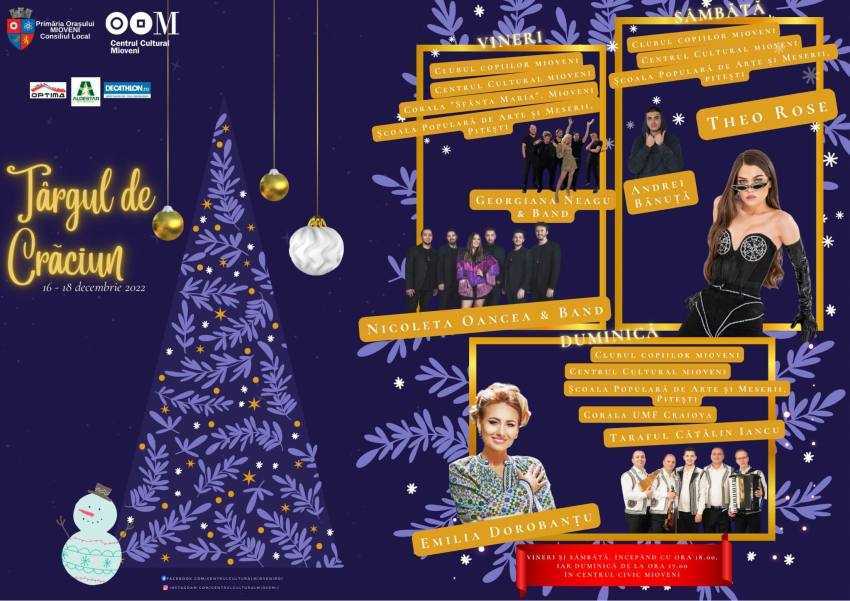 Cea de-a șasea ediție a Târgului de Crăciun de la Mioveni oferă publicului trei zile și trei seri de distracție cu artiști de top, concerte live, spectacole și activități artistice tematice, produse tradiționale, dulciuri cât cuprinde, vin fiert, multă lumină și culoare, alături de surprizele plăcute de care vor avea parte, deopotrivă, atât cei mici cât și cei mari.