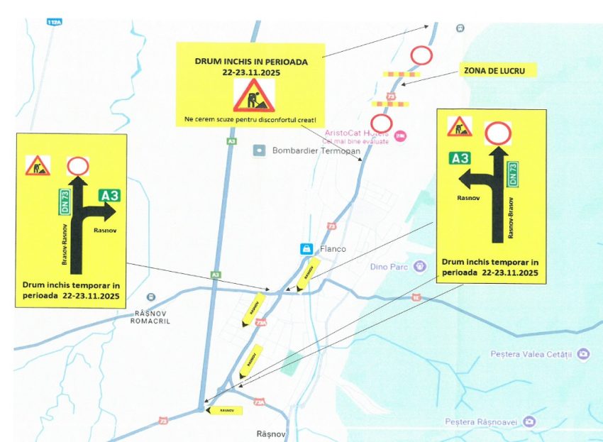 DRDP Brașov anunță că începând de astăzi, 22 noiembrie 2025, de la ora 07:00, traficul pe DN73, pe tronsonul kilometric 118+300 de metri – 126+057 metri, între localitățile Cristian și Râșnov, județul Brașov, este închis complet pe ambele sensuri.