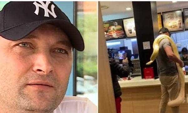 Amintim că este vorba despre bărbatul care a intrat într-un restaurant de tip fast food din Romania cu un șarpe imens pe umăr.