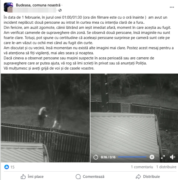 Dacă cineva a observat persoane sau mașini suspecte în acea perioadă sau are camere de supraveghere care ar putea ajuta, vă rog să îmi scrieți în privat sau să anunțați Poliția.